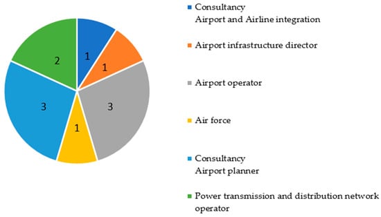 We selected our interviewees using a combination of purposive and snowball sampling methods. Our sample comprises actors who possess direct involvement and expertise within their respective domains, offering diverse perspectives crucial for understanding the complexities surrounding the integration of H2 technologies in the aviation sector. In total, our sample consisted of representatives from various sectors intimately involved in the aviation industry. This included three consultancy professionals specialising in airport planning, three individuals from airport operating companies, two experts from power transmission and distribution network operations, one consultant specialising in airport and airline integration, and one director with experience in the air force, as well as one director with experience in airport infrastructure management (Figure 1). Our sample comprised actors who possess direct involvement and expertise within their respective domains, offering diverse perspectives crucial for understanding the complexities surrounding the integration of H2 technologies in the aviation sector.