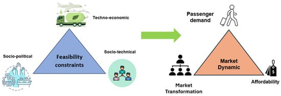 Feasibility constraints being faced in the global energy transition have been explored by ref. [33], and barriers facing to net-zero aviation sector have been investigated by Gordon et al. [34]. Drawing from existing research on barriers to decarbonisation of aviation [7,34], and insight on feasibility constraints from Mirzania et al. [32], we define feasibility constraints in the decarbonisation of aviation as the practical limitations and challenges that need to be addressed in transitioning towards greener and more sustainable practices within the aviation industry. These constraints encompass various aspects, including technical, economic, regulatory and policy, operational, and infrastructural considerations. In order to systematically understand feasibility constraints, these challenges can be categorised into three dimensions: socio-technical (technological feasibility, viability, and reliability), techno-economic (operational and infrastructure feasibility, and production costs), and socio-political (regulatory framework and policy support). As illustrated in Figure 2, these constraints directly shape key aspects of market dynamics—namely, passenger demand, market transformation, and affordability. Thus, decarbonisation pathways can be considered infeasible due to constraints in any of these dimensions [35].