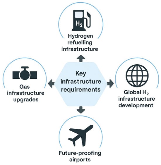 Despite substantial research on the technical feasibility of hydrogen-powered aircraft—particularly in relation to propulsion systems and fuel cell technologies—the literature reveals a significant gap concerning the integration of hydrogen within airport inf restructure [25,26,27]. Recent literature underscores that H2-powered aviation is increasingly recognised as a critical policy and economic research priority in the pursuit of net-zero aviation transitions. Dua and Guzman [28] underscore the need for coordinated policy frameworks and economic strategies to support the integration of hydrogen technologies into the aviation sector. They emphasise the importance of aligning technological advancements with enabling policies to address implementation barriers. A more holistic approach is therefore needed to evaluate not only aircraft-level feasibility but also broader system-level requirements for a hydrogen-powered aviation future.