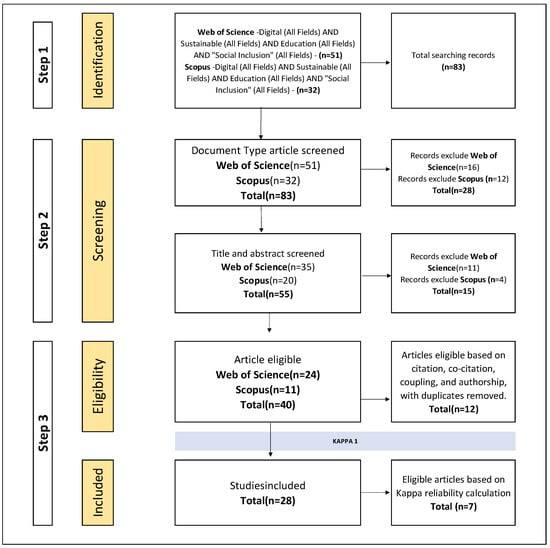 This selection process aimed to eliminate semantic noise and reinforce the thematic coherence of the final sample, ensuring that the selected records meaningfully contributed to the identification of research trends, theoretical approaches, and gaps in the literature on the intersection between digitalization, sustainability, education, and social inclusion. As emphasized by [], this initial filtering step is essential to ensure the consistency of subsequent analytical stages, such as bibliometric mapping, co-authorship and keyword co-occurrence networks, and the formulation of integrative models.
