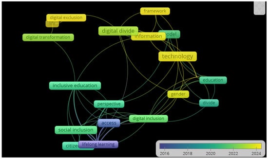 From 2022 onward, keywords such as “digital exclusion”, “digital divide”, “technology”, “framework”, and “information” began to emerge, signaling a continued effort to explore pathways for reducing digital exclusion and increasing the effective use of information and technology.