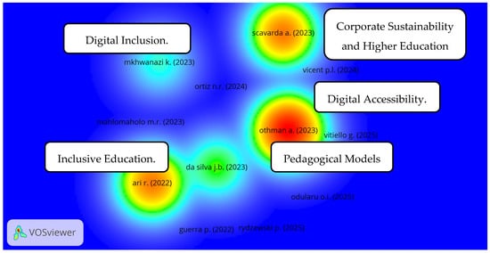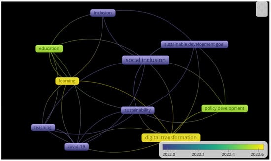 An analysis of keyword co-occurrence in Scopus (Figure 3) revealed that during the early part of 2022 (second half of the year), prominent terms included “social inclusion”, “inclusion”, “sustainable development goal”, “teaching”, and “COVID-19”. These keywords reflect the impact of the COVID-19 pandemic and the forced digitalization that occurred during periods of social isolation, which emphasized the urgent need for new models of teaching and learning.