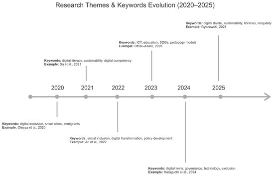 Timeline of research themes and keyword evolution (2020–2025) [,,,,,].