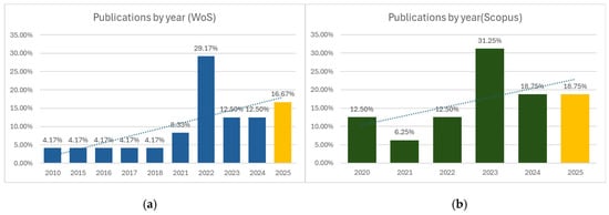 Percentage distribution of publications per year in the analyzed databases: (a) Publications by year in WoS and (b) publications by year in Scopus.
