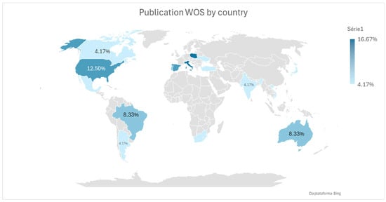 Among the countries with the highest number of publications in WoS are Italy (16.67% of the articles), Poland (16.67%), Spain (12.50%), and the United States (12.50%). Brazil (8.33%) shares fifth position with Australia and Portugal regarding research on this topic (Figure 6).