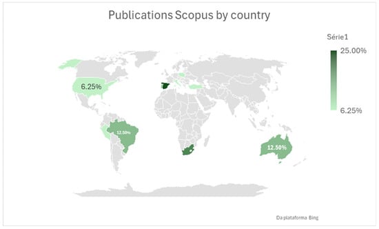 In Scopus (Figure 7), the countries with the most publications were Spain (25%), followed by South Africa (18.75%). Brazil (12.50%) ranked third, alongside countries such as Portugal and Australia.