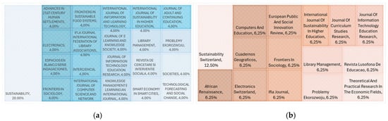 Distribution of articles by journal in the analyzed databases: (a) Distribution of publications by journal in the WoS database and (b) distribution of publications by journal in the Scopus database.