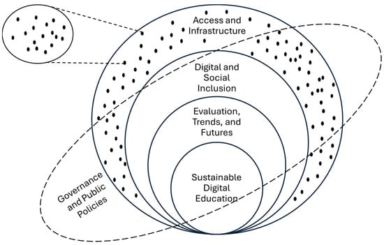 Our proposed integrative model offers a relevant conceptual contribution by synthesizing selected articles into structured axes, represented as concentric spheres. These layers include “Access and Infrastructure”, “Digital and Social Inclusion”, and “Evaluation and Trends”, with “Sustainable Digital Education” at the core. A transversal “Governance and Public Policies” axis connects all dimensions, reinforcing that effective actions depend on intersectoral coordination and impact indicators. This model provides a systemic, applicable, and adaptable vision for diverse educational and geographical contexts.