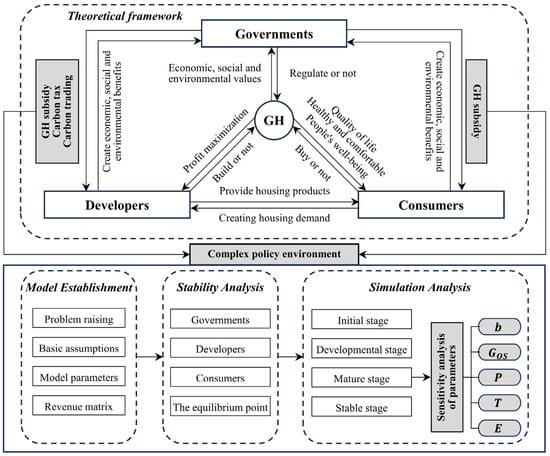 GH exhibits positive externalities (i.e., environmental benefits) and negative ones (i.e., information asymmetry), requiring targeted incentives and robust regulation to guide development. The authors conclude that the primary governmental measures supporting the GHM encompass financial subsidies for both developers and consumers, carbon taxation mechanisms, and carbon emission trading policies. Consequently, this study integrates these measures into an evolutionary game model to investigate their impacts on the development of the GHM. The framework of this study is illustrated in Figure 1.
