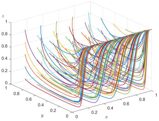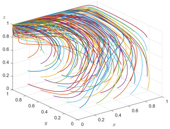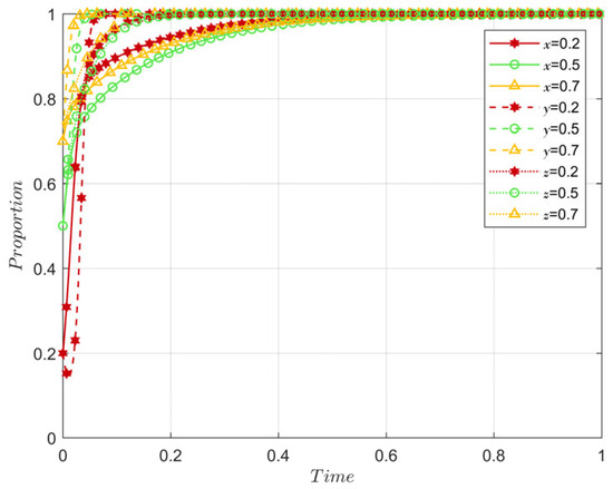 According to the analysis of the evolutionary stability of the government’s strategy choice, when x < x*, z < −(E(xbφE − μφE + 2xP + xT)/(φE2 + RDIR), x = 0 is the evolutionarily stable strategy; conversely, x = 1 is an ESS. Therefore, with the increase in x and z, the probability of government regulation decreases from x = 1 to x = 0, so x increases with the increase in y and z.