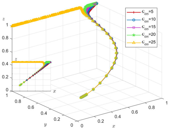 Comparing Figure 10 and Figure 11, under the initial value b = 0.3, GOS = 15, consumers choose the strategy of buying housing faster than developers choose the strategy of building GH. It can be found that the incentive effect of subsidizing consumers is better than that of subsidizing developers, which is consistent with the conclusion of He et al. [8]. In addition, b increases by 33%, and the government chooses the non-regulation strategy, while GOS increases by 67%, and the government chooses the non-regulation strategy. It can be seen that subsidies to developers have brought more financial pressure to the government.