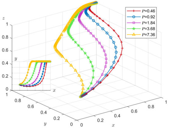 In order to analyze the influence of P changes on the process and results of the evolutionary game, P was assigned 0.46, 0.92, 1.84, 3.68, and 7.36, respectively, and the simulation results of replicating the evolution of equations 50 times over time are shown in Figure 12.
