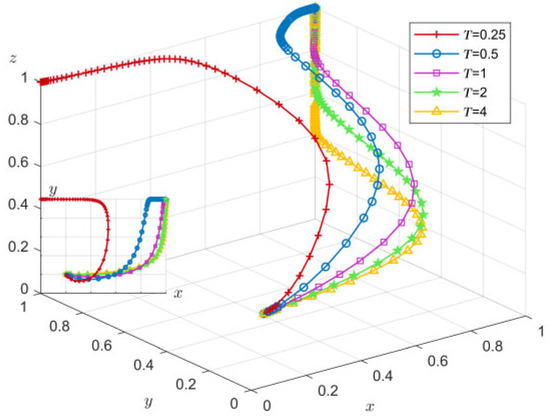 In order to analyze the influence of T changes on the process and results of the evolutionary game, T was assigned 0.25, 0.5, 1, 2, and 4, respectively, and the simulation results of replicating the evolution of equations 50 times over time are shown in Figure 13.