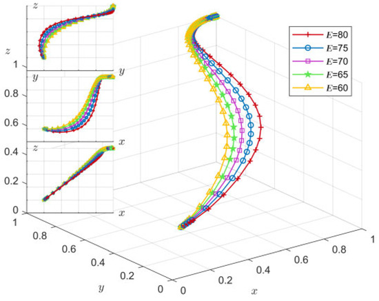 In order to analyze the influence of the change of green gap E on the process and outcome of the evolutionary game, E is assigned to 80, 75, 70, 65, and 60, respectively, and the simulation results of replicating the evolution of equations 50 times over time are shown in Figure 14.