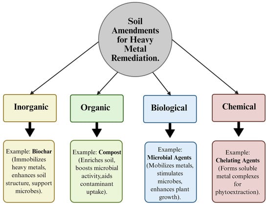 Heavy metal (HM) contamination poses a major threat to environmental health, agriculture and human well-being, requiring effective and sustainable remediation strategies. Phytoremediation, an eco-friendly and cost-effective approach, is widely used for the remediation of HM-contaminated soils. Although phytoremediation holds considerable potential in the extraction, stabilisation and degradation of HMs, its effectiveness is often constrained by limited metal bioavailability, plant stress under toxic conditions and slow metal uptake rates. To address these limitations, this review examines the integration of various soil amendments—the application of biochar, compost, plant exudates, microbial agents and chelating agents—to enhance phytoremediation efficiency. This review critically evaluates empirical evidence on the effectiveness, scalability, economic feasibility and environmental impact of these amendments. By synthesising recent studies, this review advances the understanding of amendment-assisted phytoremediation as a viable solution for treating HM-contaminated soils. In addition, this review identifies practical applications, discusses limitations and explores the potential synergies of these amendments to optimise phytoremediation strategies, ultimately contributing to more effective and sustainable environmental cleanup efforts.