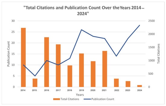 The trends in publication and citation counts (cumulative citations received by publications from each year from 2014 to 2024) are shown in Figure 2. The bar chart represents the citation count, and the line graph depicts the annual publication output. Publication trends are an indicator of research interest in this field (phytoremediation). Between 2014 and 2016, research output remained low. However, a sharp increase between 2017 and 2024 indicates a growing interest in this field. Steeper slopes in the publishing trend indicate periods of heightened research activity, reflecting increased awareness and the significance of studies published during those years.
