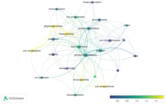 A keyword co-occurrence analysis was conducted to identify emerging research themes and key focus areas in phytoremediation and soil amendments for HM-contaminated soils. Figure 3 shows the network of frequently co-occurring keywords, providing insights into major research directions.