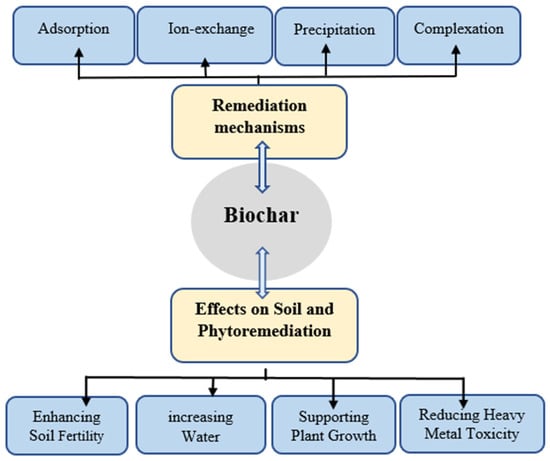 Because of its unique physicochemical properties, such as alkaline pH, large specific surface area (SSA) and strong HM immobilisation capacity, biochar plays a crucial role in soil improvement and HM remediation [26]. Its large surface area drastically enhances HM absorption by increasing the number of active sites and optimising the pore structure, thereby improving the chemical interactions and stability. Biochar facilitates the formation of metal–biochar complexes via cation-exchange with metals such as Na+, K+, Ca2+ and Mg2+ as well as via physical adsorption [27,28]. Its alkaline nature, particularly at high pyrolysis temperatures or when derived from specific feedstock, can increase soil pH, leading to the precipitation of HMs as insoluble compounds. This process reduces the mobility and bioavailability of HMs in contaminated soil [29]. The pH of biochar is considerably affected by the pyrolysis temperature. Higher temperatures generally produce more alkaline biochar. For example, biochar generated at 700 °C typically has a higher pH than that produced at 400 °C, regardless of the feedstock type or residence time [30,31]. Figure 4 shows the overall impact of biochar on soil properties and phytoremediation.