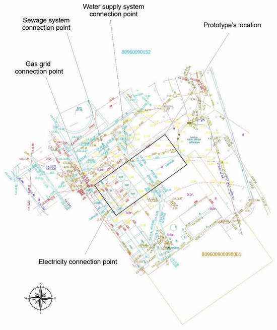 The Figure 2 shows a schematic of the planned Landfill A complex with different colours showing land use purposes and infrastructures, where various utility connection points, as well as the location of the prototype installation itself, are marked. A black rectangular outline in the middle of the image indicates the planned location of the prototype. The prototype installation site provides sufficient space for equipment deployment, service personnel access and possible future upgrades. The site is also close to the main engineering network connections, thus reducing connection installation times and costs.