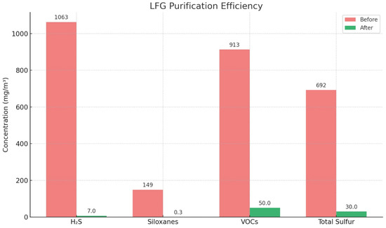 This research also builds on the potential of biological desulfurization, which is a cost-effective and eco-friendly method for bulk H2S removal, producing valuable byproducts such as elemental sulfur [30]. However, given the high concentration of siloxanes and VOCs detected in LFG samples from Landfill A, biological methods alone are insufficient. Therefore, the integrated purification system proposed in this study combines multiple technologies to ensure that all relevant contaminants are brought below acceptable thresholds.