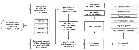 This review identifies three key limitations: (1) A fragmented approach to examining urban subsystems without an integrative framework; (2) Insufficient focus on pollution’s systemic effects on urban sustainability; and (3) Limited heterogeneity analysis. Building on these gaps, our study first proposes research hypotheses based on existing literature and the definition of urban sustainable development, positing that air pollution affects urban sustainability through four dimensions: population, industry, space, and society. Subsequently, an empirical model is constructed and estimated using the Three-Stage Least Squares (3SLS) method. Following the acquisition of baseline regression results, robustness tests are conducted to verify the findings. Additionally, multiple heterogeneity tests are performed on the results. Through this approach, our study contributes by: (1) pioneering a systematic investigation of air pollution’s feedback effects on urban development; (2) conceptualizing “urban sustainable effects” from a multidimensional perspective; and (3) clarifying the spatial and structural heterogeneities in the pollution-development relationship. These findings will provide key insights for formulating sustainable urbanization strategies under environmental constraints.
