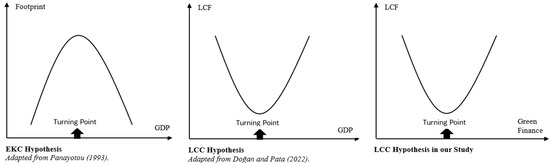 Comparative Illustration of EKC and LCC Frameworks. This comparative figure provides an intuitive understanding of how the LCC hypothesis developed in this study diverges from the classical EKC approach by focusing on green finance as the structural transformation driver rather than GDP [41,54].