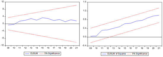 According to the results presented in Table 3, all variables contain unit roots at their levels but become stationary after first differencing. Moreover, none of the series are found to be integrated of order two, I(2). Therefore, the ARDL bounds testing approach developed by Pesaran, Shin, and Smith [74] is deemed suitable for analyzing the long-run relationships among the variables. The ARDL model is particularly advantageous as it allows for the inclusion of variables with different integration orders (i.e., I(0) and I(1)) and performs well even with small sample sizes [79].