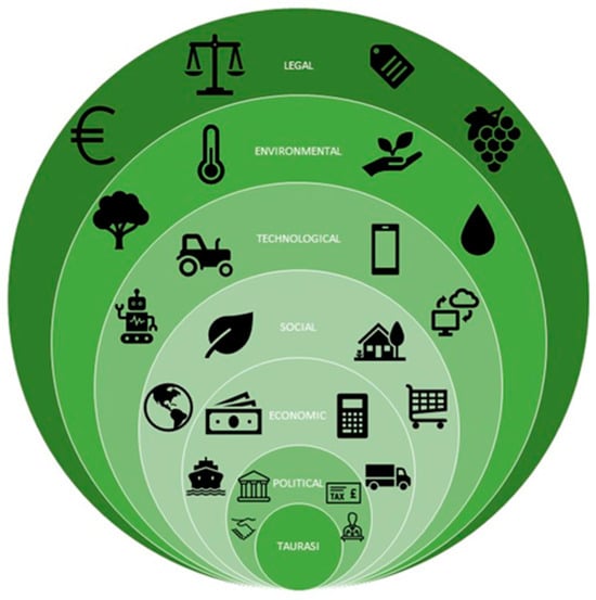 Our research incorporates many methodologies aimed at gaining a comprehensive understanding of the green strategy of Taurasi. The PESTEL framework is the major means, which looks at external factors affecting the creation of the town of Taurasi. This organized pathway is a way to study politics, economy, society, technology, the environment, and legal factors that influence operations and dealings in the territory [,].