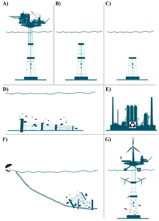 Schematic illustration of decommissioning options for an existing platform: (A) the original structure as is; (B) submerged structure left in place; (C) topping; (D) horizontal reefing in situ; (E) complete removal; (F) non-in situ reefing; and (G) platform conversion for multiple eco-sustainable uses.