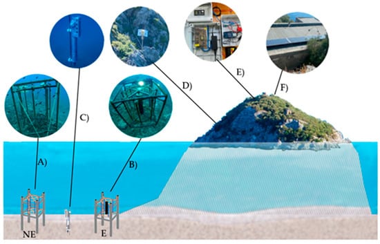 These steel structure prototypes consisted of 8 steel cathodes in the shape of cylindrical bars, with a diameter of 3.34 cm and a length of 90 cm. Prototype A was not electrified, and the bars were left in free-corrosion conditions and operated as a control in the experiment, whereas prototype B was electrified for the cathodic polarization of the bars by means of a constant potential difference of 2.5 V. Polarization was performed using an anode, placed in the center of a suitable electrochemical cell, consisting of a titanium mesh wrapped around a PVC cylinder, with a diameter of 15 cm and a length of 90 cm. The software package for the acquisition and control of the applied voltage values was developed in C language, with an acquisition frequency set to 1 sample per minute. Parameters such as the potential difference, primarily to verify that it remained constant at 2.5 V, as well as the current passing through the circuit, were recorded. A schematic overview of the field experiment is shown in Figure 2. Additional details can be found elsewhere [15]. Besides the steel prototypes, a multiparameter probe (C in Figure 2) for the detection of seawater conductivity (salinity), temperature, and dissolved oxygen concentration was also deployed. Environmental variables were monitored with an acquisition time of 5 min.
