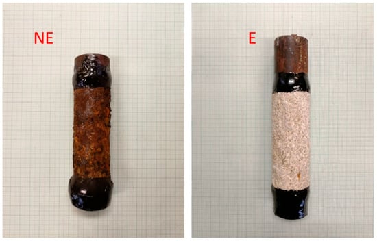 Electrochemical tests were carried out on one sample of E and one sample of NE steel bars collected at Time 1, Time 3, Time 5, and Time 6 by means of EIS. For such analysis, pieces of steel bars were suitably covered with epoxy resin to obtain a surface that was as homogeneous and geometrically defined as possible (Figure 3). The single samples of both bar types were chosen by using two criteria: (i) the presence of a sound deposit after cutting; (ii) to have a sufficient extension of the deposit in the sample to be representative of that present in the whole bar, so as to obtain an average value of its surface impedance.