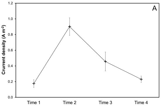 From Time 1 to Time 2, a significant increase in the current density was observed (from 0.175 to 0.902 A m−2 in Figure 4A). Such an increase is limitedly determined by the slight increase in temperature and correspondingly the increase in conductivity, which promotes the current flow with a power supply constantly kept at 2.5 V. Thus, other environmental factors appear to be responsible for the increase in the cathodic current density, which is responsible for the initiation and progress of mineral deposition, such as the water current velocity.