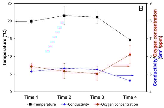 During summer and autumn periods (Times 1, 2, and 3), the oxygen concentration and temperature remained almost constant, around 5 mg L−1 and 21 °C, respectively. In the winter (Time 4), a decrease in temperature from 21 to about 15 °C was observed. As expected, this resulted in an increase in the concentration of oxygen to about 6 mg L−1. Conductivity (i.e., salinity) followed a similar temporal trend to temperature (Figure 4B).