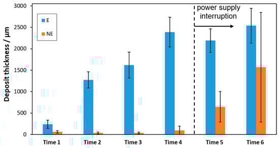 The thicknesses of the mineral deposits increased to about 2.5 mm over time from Time 1 to Time 4 under cathodic polarization on E bars, thus indicating an effective progress of mineral deposition induced by the supplied cathodic current. Such an increase was not observed for the NE bars, in the same time interval, due to the lack of cathodic polarization.