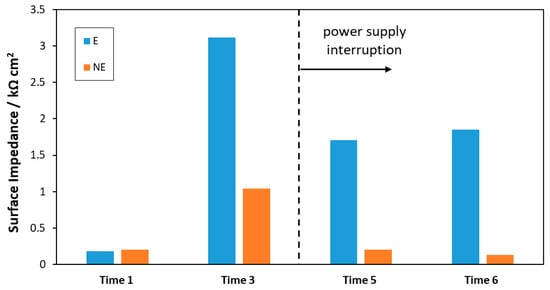 The values of the surface impedances of E and NE samples at Time 1 were very low (0.18 and 0.20 kΩ cm2, respectively) because they were measured only 14 days from the in situ installation of the steel prototypes. Furthermore, these values were similar since the induced mineral deposit on E bars was so thin (corresponding to a low current density at Time 1, Figure 4A) that its protective effect was indistinguishable from the rust layer naturally formed on NE bars. A significant difference between the surface impedance of the E and NE bars was observed at Time 3 (3.12 vs. 1.04 kΩ cm2), when the induced mineral deposition had progressed in terms of deposit thickness. Therefore, it can be stated that an increase in the mineral deposit thickness corresponds to an improvement in the degree of corrosion protection of the steel substrate.