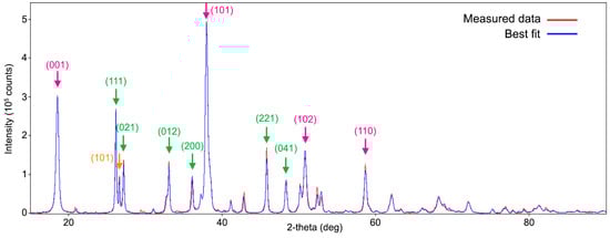 A background-subtracted powder diffraction profile showing the characteristic peaks and crystalline nature of the Time 5 sample: experimental data (red curve) and corresponding best fit (blue curve). Arrows indicate the main diffraction peaks of aragonite (green), brucite (magenta), and quartz (orange) together with the corresponding Miller indices.