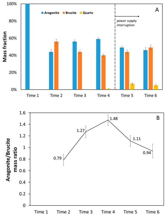 Although the measured fraction values are affected by uncertainties, fitting the whole powder pattern provided a quantitative estimation of the composition of each sample, as summarized in Figure 9A: apart from the thin deposit collected after 14 days (Time 1), which consisted almost exclusively of aragonite, all other samples contained more aragonite than brucite, considering that the mass ratio of aragonite–brucite was higher than 1 (Figure 9B). The mass ratio increased from Time 2 to Time 4, and after the interruption of the power supply in correspondence with Time 5 and Time 6, it decreased to a value of around 1. In the absence of power supply, even a decrease in the amount of CaCO3 can be noticed in Figure 9A, while the amount of brucite remained almost the same.