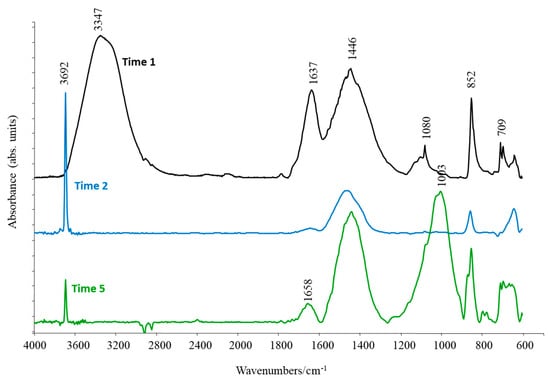 Average absorbance spectra of Time 1, 2, and 5 samples, in the range 4000–600 cm−1.