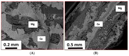 SEM images of E samples acquired in two different areas (A,B) with backscattered electrons, showing the distribution of Ca (bright part of the images) and Mg (dark part of the images) at Time 5.