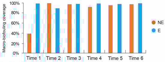 The macro-biofouling covered over 90% of the surface of both NE and E steel bars at all the sampling times considered, except for Time 1 (14 days of immersion), at which a clear difference between the macro-biofouling coverage of the NE bar and E bar was observed (38.6% and 99%, respectively; Figure 13).
