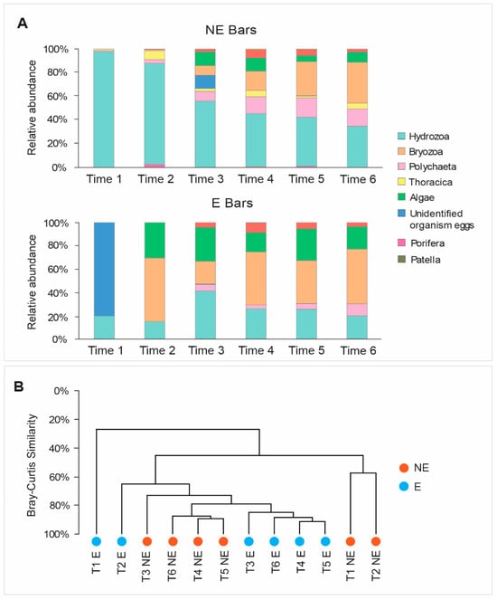 (A) Macrofouling composition on NE and E steel bars at different sampling times (Time 1–Time 6); (B) Bray–Curtis analysis showing the similarity among macro-biofouling compositions at different sampling time intervals (Time 1–Time 6, abbreviated as T1–T6).