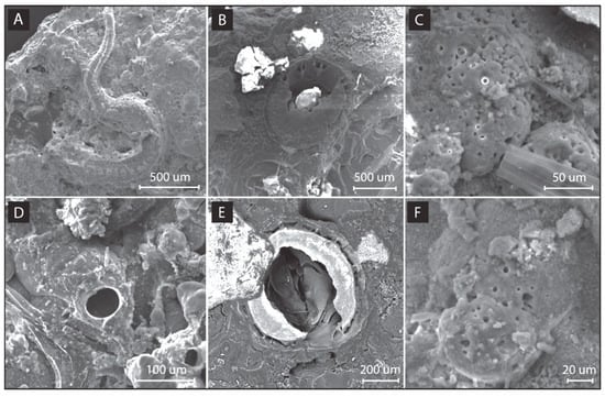 Morphological SEM analyses revealed signs of the perforation (diameter 950 μm; Figure 15B) of the mineral deposit during the polarization (Time 3 and Time 4; Figure 15C), which may be attributable to juvenile polychaetes or barnacles, given the compatible dimensions between these organisms and the circular structures observed [36,37] (Figure 15A,F). Other smaller perforations (diameter 5–50 μm; Figure 15C,F) in the mineral deposit were possibly due to other burrowing organisms such as endolithic sponges, cyanobacteria, and algae [38]. Similar perforations of the calcareous deposit were also found after the polarization phase (Figure 15D–F), suggesting a slight but continuous burrowing process by marine organisms (Figure 15D,E).