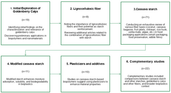 As shown in Table 2, the selected articles can be categorized into four main groups. The first group involves articles that explore the feasibility of preparing food packaging. The second involves studies promoting the use of fiber to improve the properties of cassava starch. The third involves studies focusing on the production of bioplastics and their properties. Finally, certain works evaluate the safety aspect of biopolymers. The search reviewed studies from 2017 onwards.
