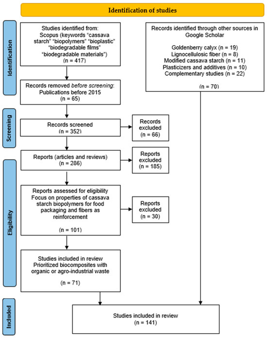 As selection criteria, only records from the year 2015 onward were considered. Additionally, only research and review articles were included, with a particular emphasis on cassava starch-based biopolymers reinforced with fibers, prioritizing fibers derived from agro-industrial residues. An exhaustive review was conducted on various types of fibers, including coconut, cassava bagasse, fruit peels, chitosan, rice husk, yerba mate, algae, and others, with applications in the food packaging industry—such as smart packaging, food preservation, and edible films. The review also focused on the evaluation of biopolymer properties, including mechanical, physicochemical, antioxidant, and antimicrobial characteristics.