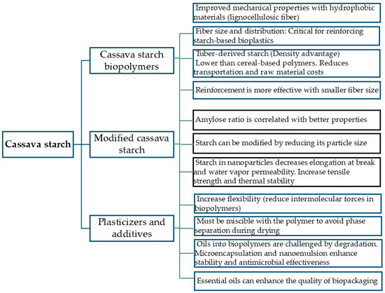 One earlier study explored the potential of goldenberry calyx to produce bioplastic by mixing it with corn starch and glycerin [3]. However, the performance properties of biopolymers depend on the starch source. For example, films made from tuber starch show lower density compared to those derived from cereals [17], and low density is desirable in packaging as it reduces transportation and raw material costs. Thus, starch from a tuber source such as cassava becomes a pertinent option for biopackaging due to its favorable properties. Consequently, exploring alternative approaches to utilize goldenberry calyx, such as using a new starch source in conjunction with the calyx fiber that will be part of the composition of the biocomposite, is relevant. In this case, the selected source is cassava starch, a tuber starch. Figure 5 presents a summary of the main findings regarding the application of cassava starch in biopolymers.