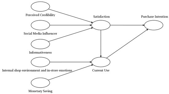 This study is grounded in the S-O-R framework, which provides a robust lens for explaining how environmental and social cues influence consumer psychology and behavior in fashion live commerce. The S-O-R model posits that external stimuli (S)—such as environmental signals or social cues—induce internal emotional or cognitive states (O), which subsequently drive behavioral responses (R) [24]. In this study, perceived credibility, social media influencer characteristics, informativeness, internal shop environment, and monetary savings function as key stimuli that shape consumer perceptions during live commerce experiences. As noted by several works [2,15,45,46,47], such stimuli play a crucial role in shaping affective and evaluative responses. In this context, satisfaction and current use represent organismic states that reflect users’ experiential and cognitive engagement. These, in turn, lead to the behavioral outcome of purchase intention. This study extends the traditional S-O-R model by incorporating constructs relevant to digital and interactive commerce environments, emphasizing the emotional and experiential pathways that convert engagement into transactional behavior.