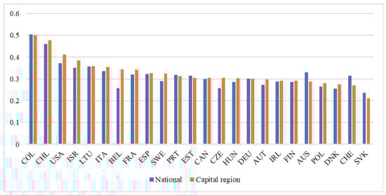 Urban centers offer substantial opportunities for the development of technology, education, employment, and social engagement. However, their expansion is accompanied by serious challenges: a shortage of affordable housing, transportation gridlock, and pronounced social inequality, which becomes especially acute in megacities. The inability to ensure inclusive economic growth undermines social cohesion, fuels conflict, and erodes public trust in democratic institutions. Although major agglomerations typically demonstrate higher development indicators compared to other regions, they are often marked by the most severe social disparities. In three-quarters of the 24 OECD countries, capital regions exhibit higher levels of inequality than national averages. Urban inequality is multifaceted and extends beyond income differences. Residents of deprived neighborhoods typically face limited access to quality housing, employment opportunities, and public services. According to the Gini index, capital regions exceed the national average in 18 out of the 24 OECD countries studied [70] (Figure 2).