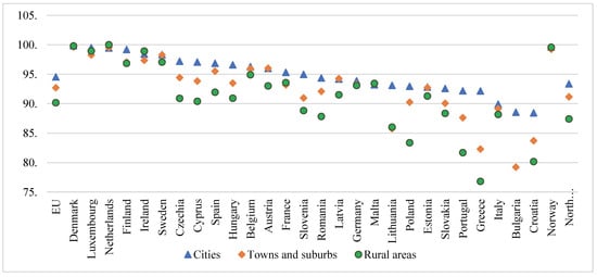 The European Manifesto on Digital Freedoms and Principles of the Digital Era [71] proclaimed “digitalization that will not exclude any social group. It should serve everyone, ensuring gender equality and inclusiveness, including elderly citizens, rural populations, people with disabilities, and marginalized groups...”. As of 2024, Denmark, Luxembourg, the Netherlands, Ireland, Sweden, Belgium, Malta, and Germany demonstrated almost identical levels of internet coverage in both rural and urban areas. The most significant gap between urban and rural internet access was observed in Greece and Bulgaria, where the difference reached 15 percentage points (p.p.) in 2024 [66] (Figure 3).