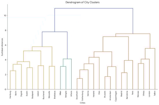 To identify typical urban development profiles, a clustering of 27 European cities was conducted. Cities were selected based on criteria of geographic diversity, level of economic development, and degree of digital infrastructure. The modern development of smart cities is inseparable from both digital and environmental dimensions. The inclusion of environmental indicators in the clustering reflects an expanded understanding of the enabling environment for digital inclusion, as evidenced by the models of the Smart City Maturity Index. The clustering utilized 11 composite indicators reflecting various aspects of the smart urban environment, including: online reporting of city maintenance problems, availability of free public Wi-Fi, ability to book medical appointments online, online scheduling and ticketing for public transport, mobile access to traffic congestion information, online services for business registration, internet speed and reliability, online public access to city finances, and indicators on transportation, urban ecosystem, and air quality. Aggregated data for the period 2023–2025 available in open-access sources were used in the study [67,69].