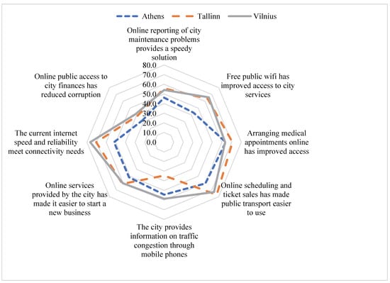 The dynamics of the Smart City Index over the 2023–2025 period show the following trends. Vilnius rose from 65th to 34th position, Tallinn improved from 32nd to 22nd place, while Athens dropped from 113th to 129th [67]. An analysis of the results of urban digital space development policies in Vilnius and Tallinn reveals significant progress in the following indicators over the period in question: online reporting of city maintenance issues, availability of free public Wi-Fi, the option to book medical appointments online, digital planning and ticketing for public transport, mobile access to traffic congestion information, online business registration services, internet speed and reliability, and public access to municipal financial data. In contrast, in Athens, the passive implementation of political decisions resulted in a significantly slower development across these domains.